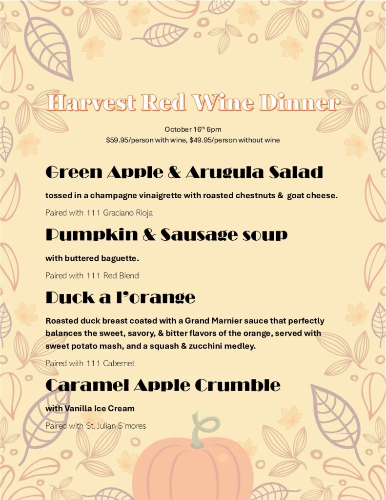 Join us for this Fall inspired red wine dinner. Chef is purting together an amazing four course Harvest menu paired with world class red wines for $59.95. We will post the menu HERE on 10/1. Call to reserve your table at 563-289-8774. We will offer a n/a mocktail version for $49.95